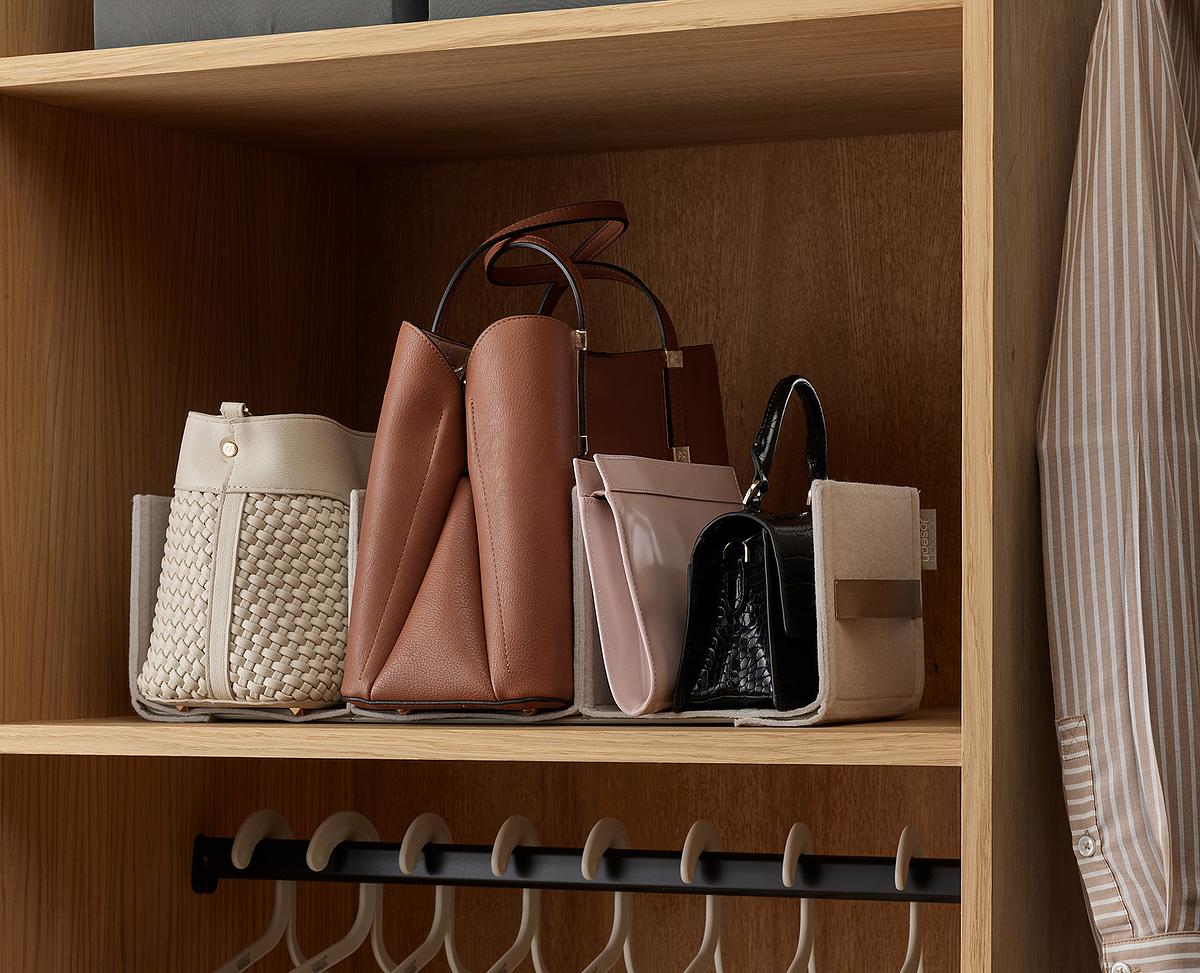 Але коли у ваших сумок є спеціально відведене місце, ваш будинок залишається чистим і охайним. Наше розумне і практичне рішення для зберігання сумок у шафі максимально ефективно використовує простір.