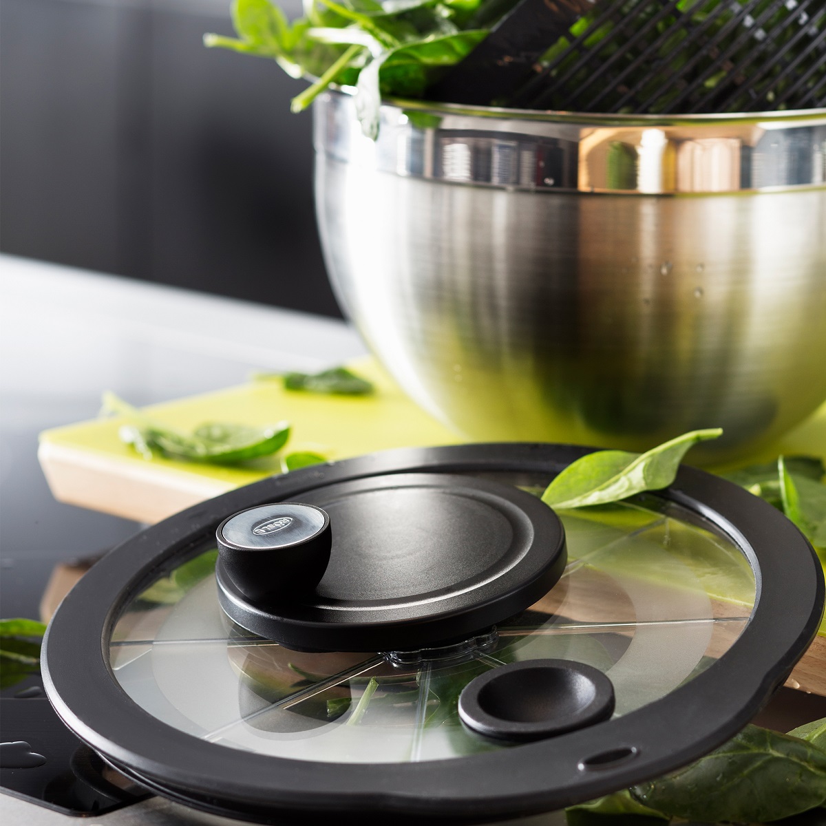 Миска для салату складається з оригінальної чаші RÖSLE з прозорою кришкою з поворотною ручкою і вставного кошика.