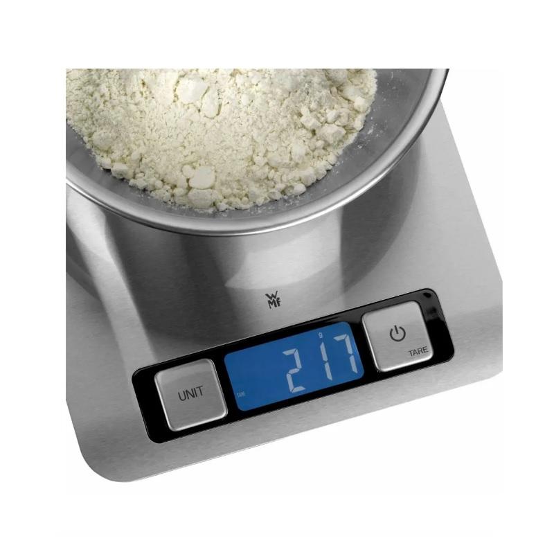 Стильні, дуже пласкі кухонні ваги від WMF з елегантною поверхнею для зважування з нержавіючого матеріалу Cromargan® і чітким цифровим дисплеєм .